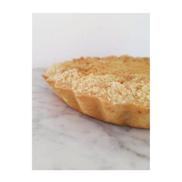 Base de masa sablee rellena de manzanas especiadas cubierta por crumble